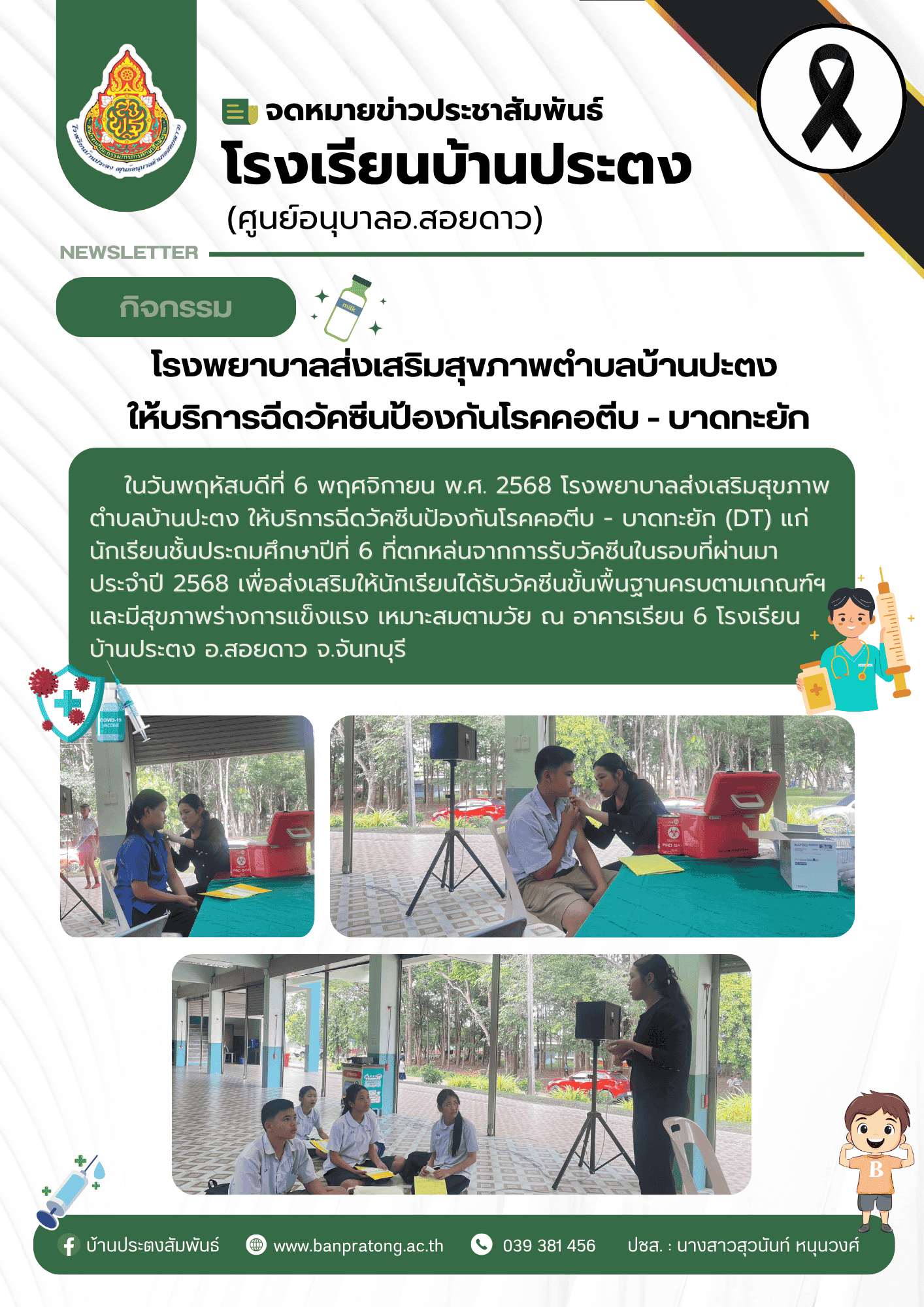 โรงพยาบาลส่งเสริมสุขภาพตำบลบ้านปะตง ได้ให้บริการ ฉีดวัคซีนป้องกันโรคคอตีบ-บาดทะยัก (dT)